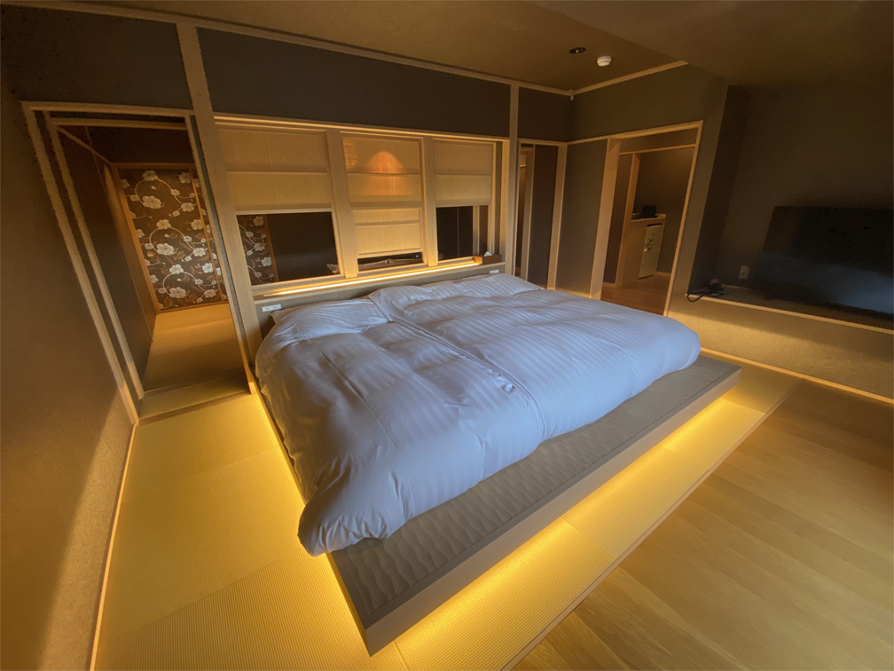 海が見える露天風呂付きのプレミアムスイート♪部屋がいっぱいで使いきれない、ベッドも4人くらい寝れて、寝返り打ち放題、なんて贅沢なーーー。