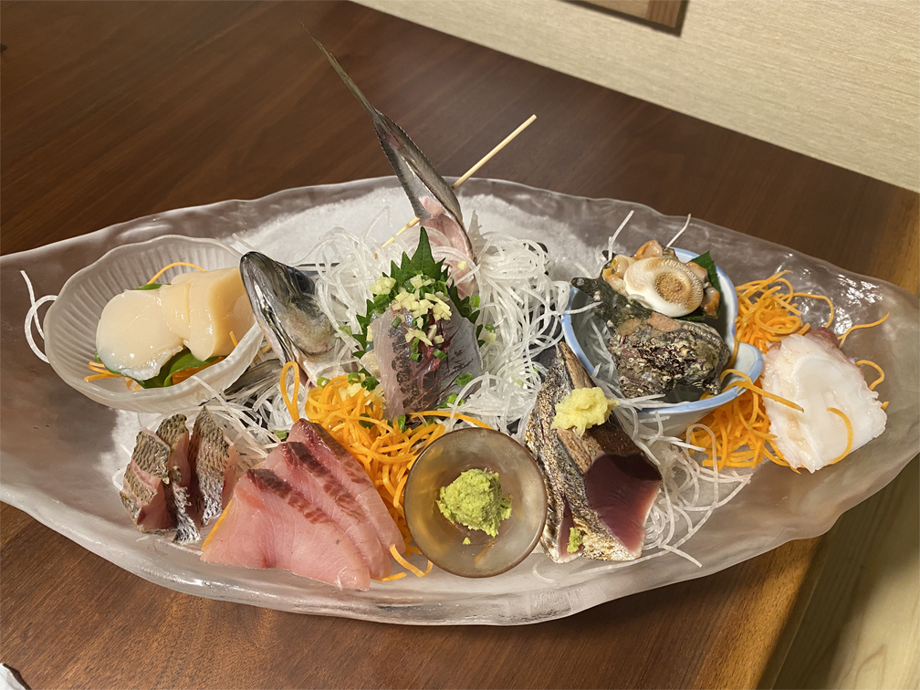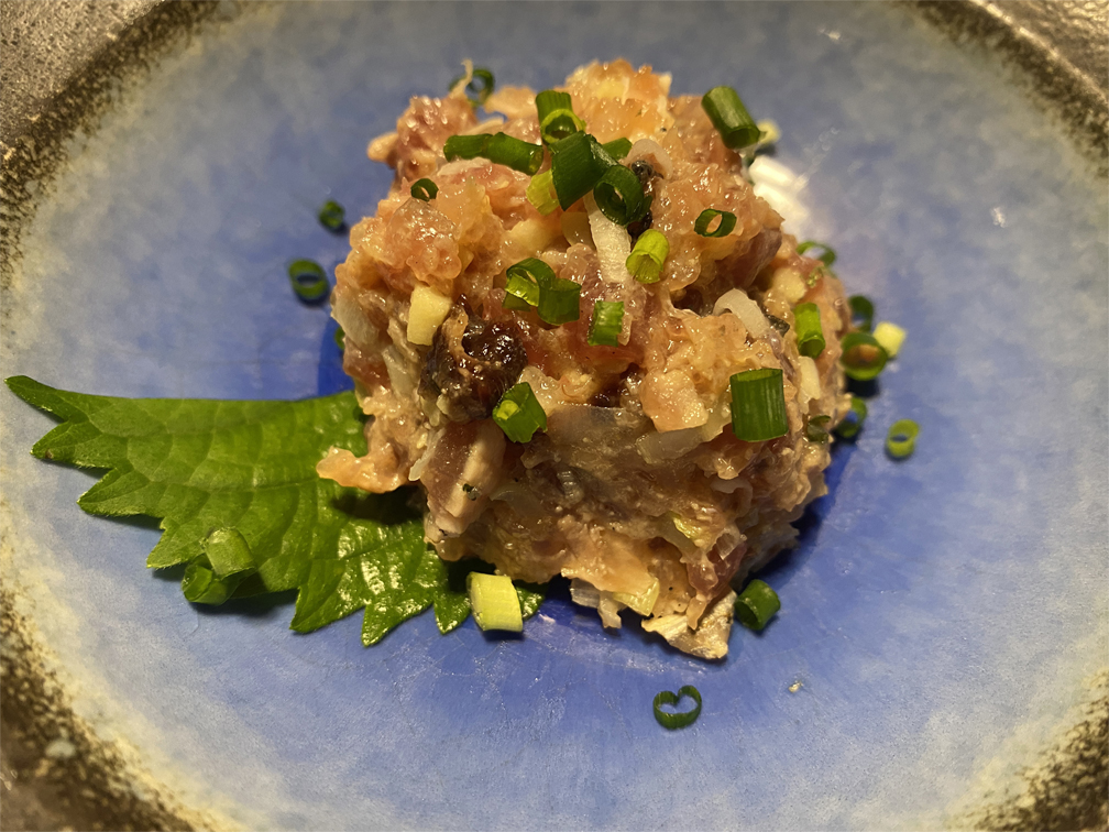 お刺身に鮑に金目鯛に・・・他にも前菜、ステーキ、鍋、と盛りだくさん。その中でも鯵のなめろうが美味しくて、なめろう茶漬けと酢なめろうが忘れられない。