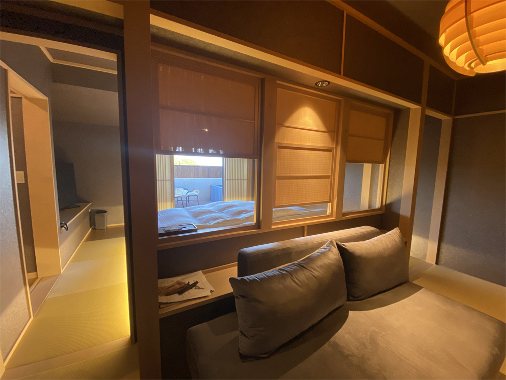 海が見える露天風呂付きのプレミアムスイート♪部屋がいっぱいで使いきれない、ベッドも4人くらい寝れて、寝返り打ち放題、なんて贅沢なーーー。