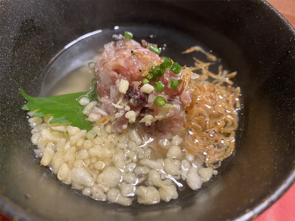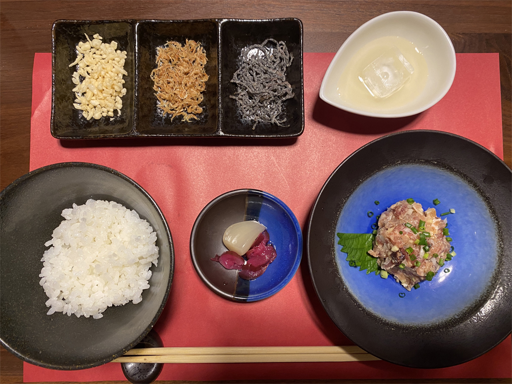お刺身に鮑に金目鯛に・・・他にも前菜、ステーキ、鍋、と盛りだくさん。その中でも鯵のなめろうが美味しくて、なめろう茶漬けと酢なめろうが忘れられない。